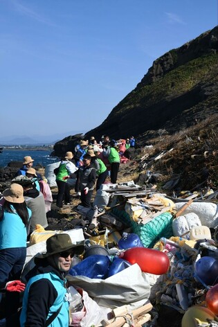 [메가경제=심영범 기자]진에어가 지난 6일 제주시 한경면 차귀도 일대에서 제주지방해양경찰청, 가톨릭아동청소년재단과 민관 합동 해양 정화 활동을 펼쳤다고 7일 밝혔다. 이날 활동에는 박병률 진에어 대표이사와 박상춘 제주지방해양경찰청장을 비롯해 총 80여명의 임직원이 참여했다. 참가자들은 평소 접근이 어려운 지역까지 이동하며 폐플라스틱, 폐스티로폼, 폐어구 등