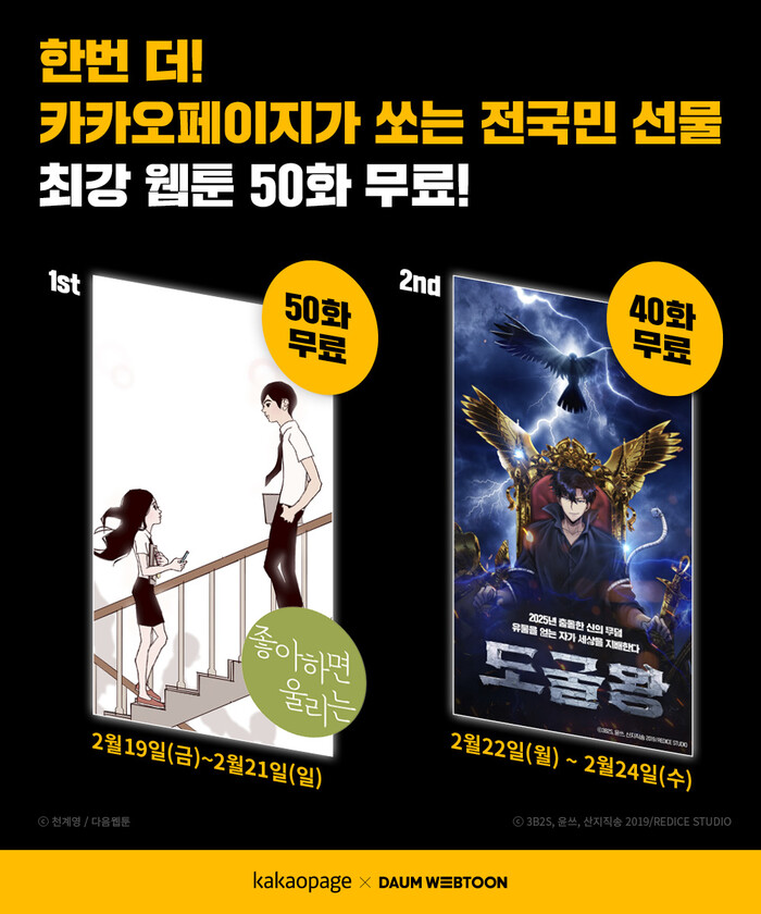 [메가경제=이석호 기자] 카카오페이지X다음웹툰 '좋아하면 울리는(글/그림 천계영)' 작품 50화, 카카오페이지 웹툰 '도굴왕(글 윤쓰(REDICE STUDIO), 그림 쓰리비투에스, 원작 산지직송)' 40화가 19일부터 21일, 22일부터 24일까지 3일간 무료로 공개된다. 해당 이벤트는 카카오페이지에서 단독으로 진행된다.