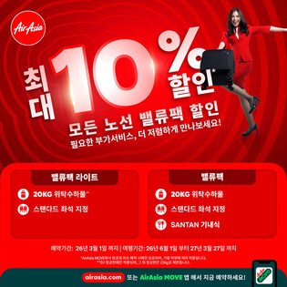 [메가경제=심영범 기자]에어아시아가 새해를 맞아 할인 프로모션을 전개한다. 예약 기간은 오는 3월 1일까지이며, 여행 기간은 2026년 6월 1일부터 2027년 3월 27일까지이다. 한국 출발 직항 노선, 편도 항공권 기준으로 △인천-방콕 9만 6400원 △인천-코타키나발루 11만 8240원 △인천-쿠알라룸푸르 12만 3750원부터 선착순으로 판매된다.