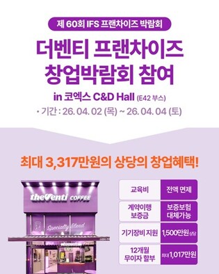 [메가경제=심영범 기자]커피 프랜차이즈 더벤티가 오는 4월 2일부터 4일까지 서울 코엑스에서 열리는 ‘2026 상반기 제60회 IFS 프랜차이즈 창업·산업 박람회’에 참가한다고 31일 밝혔다. 이번 박람회는 한국프랜차이즈산업협회가 주최하고 코엑스와 RX코리아가 공동 주관하는 국내 최대 규모의 창업 행사로, 약 300개 브랜드와 700개 부스 규모로 운영될