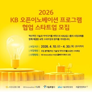 [메가경제=최정환 기자] KB금융그룹은 오는 30일까지 혁신 기술·아이디어를 보유한 스타트업과 그룹 주요 계열사가 함께 새로운 사업 기회를 만들어가는 '2026 KB 오픈이노베이션 프로그램' 참여 기업을 모집한다고 13일 밝혔다.'KB 오픈이노베이션 프로그램'은 유망 스타트업과 KB금융 주요 계열사의 협업을 통해 금융·비금융 분