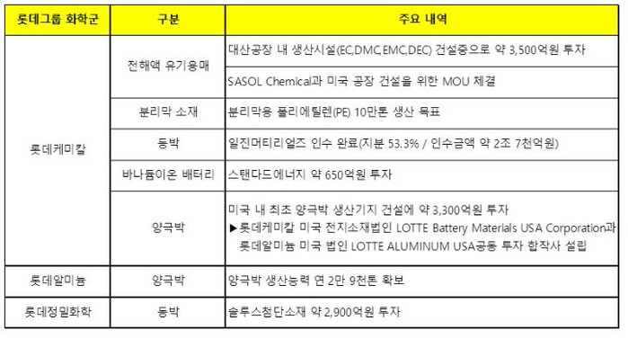 롯데그룹은 롯데케미칼, 롯데정밀화학, 롯데알미늄 3사를 통해 배터리 4대 소재인 양극재·음극재·전해액·분리막에 직간접적으로 투자를 진행 중이다.