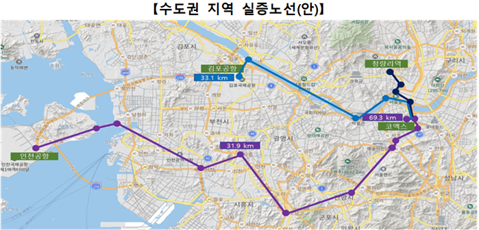 ▲ 수도권 지역 실증 노선안. [출처= 국토교통부 '한국형 도심항공교통(K-UAM) 로드맵' 중] |