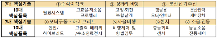 ▲ 7대 핵심기술과 10대 핵심품목. [출처= 국토교통부 '한국형 도심항공교통(K-UAM) 로드맵' 중] |