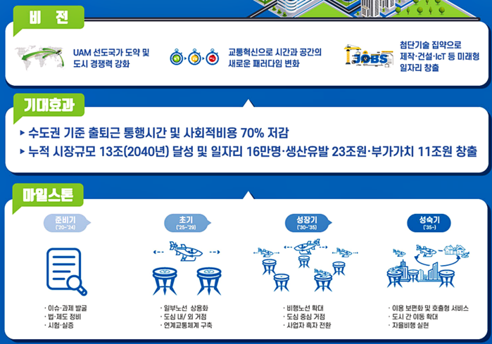정부는 로드맵을 통해 2025년 상용서비스 최초 도입을 주요 목표로 설정하고 2024년까지 비행실증, 2030년부터 본격 상용화를 준비하는 단계적 목표를 제시한 바 있다.