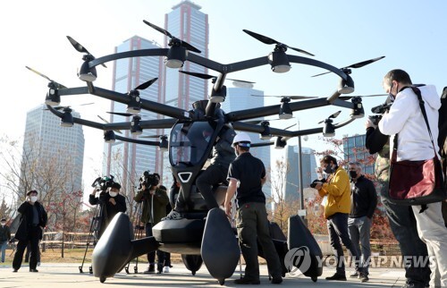 ▲ 11일 서울 여의도 한강공원 물빛무대 주변에서 서울시와 국토교통부 개최로 열린 도심항공교통(UAM) 실증비행 행사에서 중국 이항사의 2인승 드론택시 'EH216'가 무인으로 시험비행하고 있다. [사진= 연합뉴스] |
