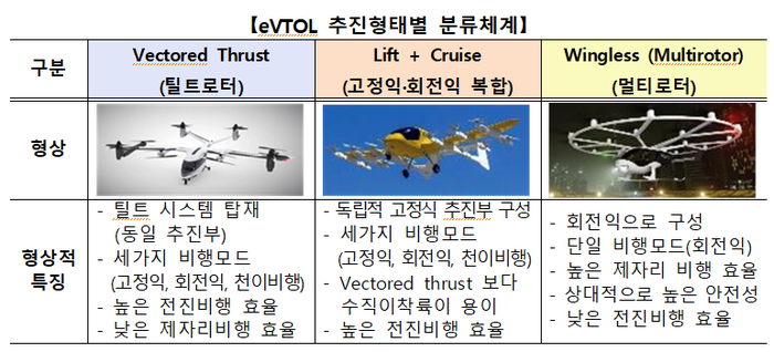 ▲ 수직이착륙기(dVTOL) 추진형태별 분류체계. [출처= 국토교통부 '한국형 도심항공교통(K-UAM) 로드맵' 중] |