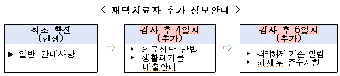 기존 확진시 제공하는 1회의 안내 문자에다, 추가로 검사 후 4일차, 검사후 6일차 등 두 차례에 걸쳐 생활폐기물 배출 안내, 의료상담 방법, 격리해제 기준 등 추가 정보를 제공할 예정이다.