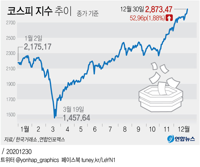 ▲ 2020년 한 해 코스피 지수 추이. [그래픽= 연합뉴스] |