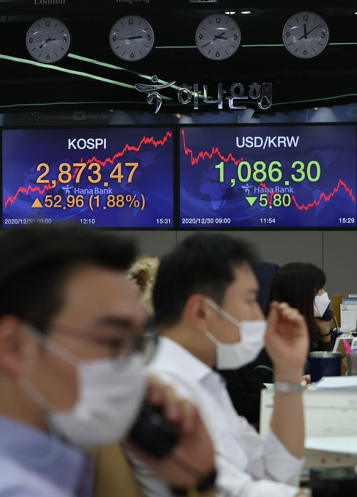 ▲ 2020년 증시 폐장일인 30일 오후 서울 중구 하나은행 본점 딜링룸에서 직원들이 업무를 보고 있다. 이날 코스피지수는 전 거래일보다 52.96포인트(1.88%) 오른 2,873.47로 마감했고, 코스닥지수는 전 거래일보다 11.01포인트(1.15%) 오른 968.42로 마쳤다. [사진= 연합뉴스] |