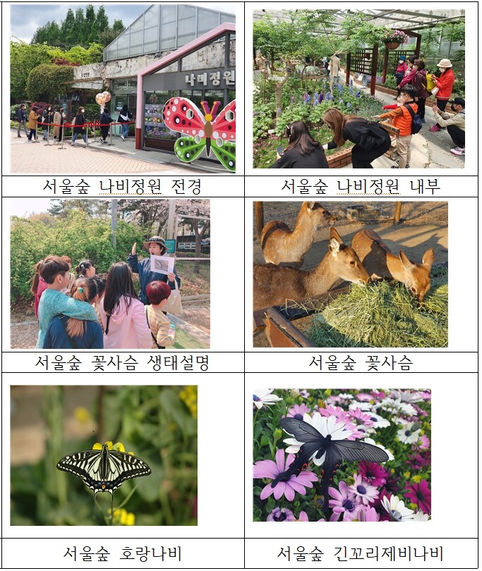 특히 어린이날을 맞아 나비를 관찰한 후 나비그림을 받아 가정에서 색칠해 볼 수 있는 비대면 프로그램이 진행된다. 또 생태숲에서는 전문 사육사에게 꽃사슴에 대한 생태설명을 듣는 무료프로그램이 게릴라식으로 전개된다.