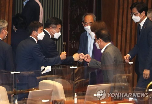 ▲ 불어민주당 윤호중 원내대표(가운데)와 한병도 원내수석부대표 등이 김부겸 국무총리 후보자 임명동의안이 통과된 뒤 의원들과 주먹인사를 나누고 있다. [사진=연합뉴스] |