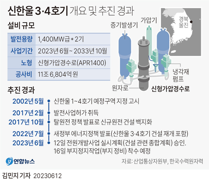 실시계획에 따르면 신한울 3·4호기는 2023년 6월부터 2032∼2033년까지 경북 울진군 북면에 1400㎿(메가와트)급 신형가압경수로(APR1400) 원전 2기를 짓는 사업으로, 약 11조7천억원의 공사비가 투입된다.