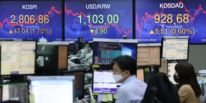 이틀 연속 상승한 코스피는 전 거래일보다 47.04포인트(1.70%) 오른 2806.86에 장을 마감하고 성탄절 연휴에 들어갔다. 종가 기준 종전 최고치(2778.68)를 사흘 만에 갈아치우며 국내 증시의 역사를 다시 썼다.