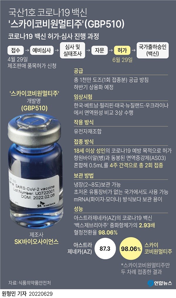 ▲ 국산 1호 코로나19 백신 '스카이코비원멀티주'의 심사 및 허가 과정과 접종방식과 성능. [그래픽=연합뉴스] |