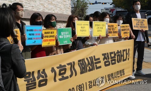 ▲ 탈핵시민행동 등 환경단체 회원들이 20일 서울 감사원 앞에서 월성 1호기 폐쇄를 촉구하는 기자회견을 하고 있다. [사진= 연합뉴스] |