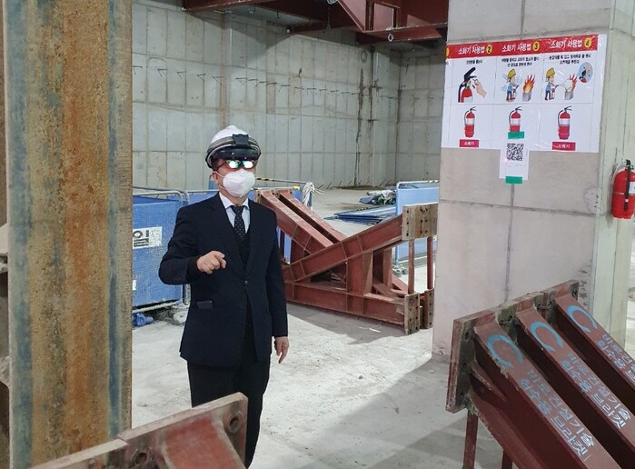 | ▲ 반도건설이 서울 가산동 지식산업센터 현장에 적용 중인 혼합현실(MR) 시연 장면 [사진=반도건설 제공] |
