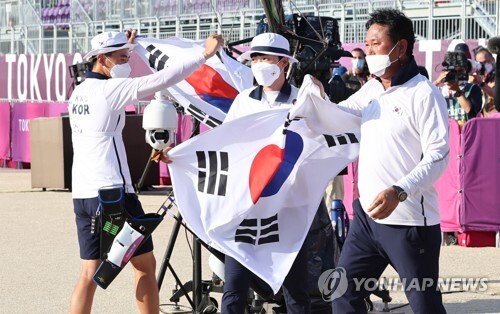 ▲ 양궁 국가대표 김제덕과 안산이 혼성 결승전에서 금메달을 획득한 뒤 태극기를 펼치고 있다. [도쿄=연합뉴스]