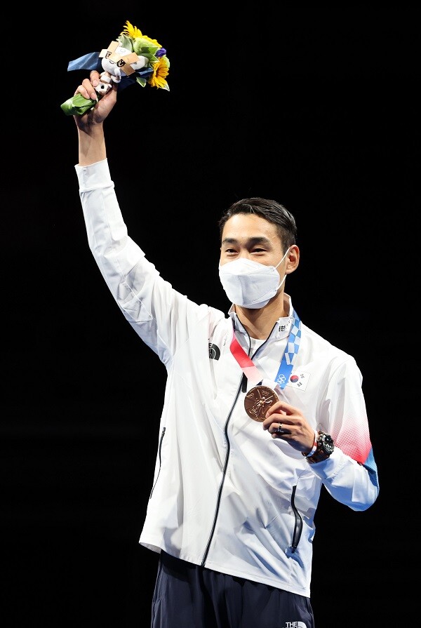 ▲ 24일 일본 마쿠하리 메세홀에서 열린 도쿄올림픽 펜싱 사브르 종목에서 동메달을 차지한 김정환이 메달을 들어 보이고 있다. [지바(일본)=연합뉴스]