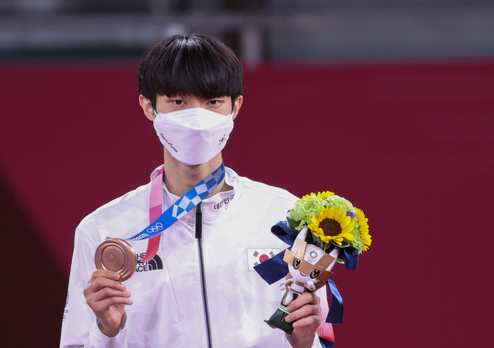 ▲ 장준이 24일 일본 마쿠하리 메세 A홀에서 열린 도쿄올림픽 남자 태권도 58㎏급 시상식에서 마스크를 쓰고 동메달을 보여주고 있다. [지바(일본)=연합뉴스]
