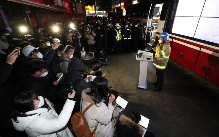 | ▲ 11일 오후 외벽 붕괴 사고가 난 광주 서구 화정동 현대아이파크아파트 주상복합아파트 신축 현장에서 소방당국 관계자가 구조 현황을 언론에 설명하고 있다. [사진=연합뉴스] |