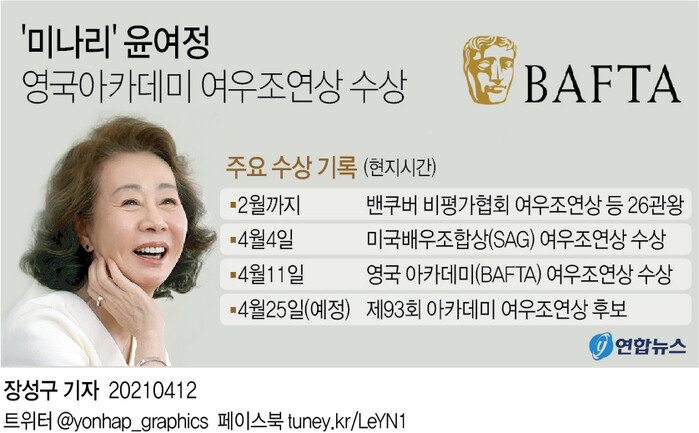 ▲ '미나리' 윤여정 영국 아카데미 여우조연상 수상. [그래픽= 연합뉴스] |
