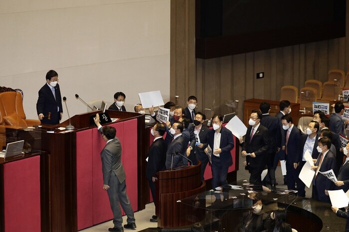 반면 국민의힘은 민주당과 박병석 국회의장이 일방적으로 법안 표결을 강행한다고 비판하며 표결에 불참했다.