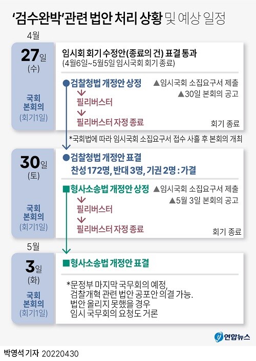 ▲ '검수완박' 관련 법안 처리 상황 및 예상 일정. [그래픽=연합뉴스] |