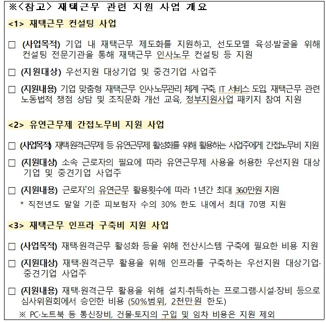재택근무 관련 지원 사업은 ▲재택근무 컨설팅 사업, ▲유연근무제 간접노무비 지원 사업, ▲재택근무 인프라 구축비 지원 사업 등 크게 세 가지다.