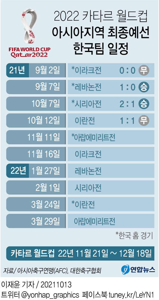 ▲ 2022 카타르 월드컵 아시아지역 최종예선 한국팀 일정. [그래픽=연합뉴스] |