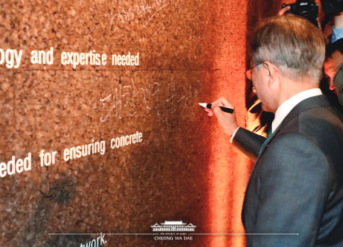 ▲ 문재인 대통령이 덴마크 코펜하겐에서 열린 '2020년 제1차 P4G 정상회의' 당시 '코펜하겐 행동 선언'에 서명하고 있다. 2020년 제1차 P4G 정상회의에서 채택된 이 선언은 "지속가능발전목표(SDGs)와 파리 기후변화 협정은 공동의 비전과 함께, 포용적 성장을 추진할 수 있는 더 나은 지속 가능한 미래를 위한 구체적 목표들을 정의한다"며 " 이 목표들을 이루기 위해서는 정부, 비즈니스, 시민사회의 리더십과 가속화된 행동이 시급하다"고 주창했다. 또, "우리는 파트너십에 관한 지속가능발전목표(SDGs) 17번이, 사람들과, 지구, 번영의 혜택을 위한 규모와 속도로, 구체적이고 지속가능한 해결책 및 결과의 실현을 위해 필요한 시장 기회를 열어주는 열쇠라고 믿는다"고 밝혔다. [출처=청와대 홈페이지] |