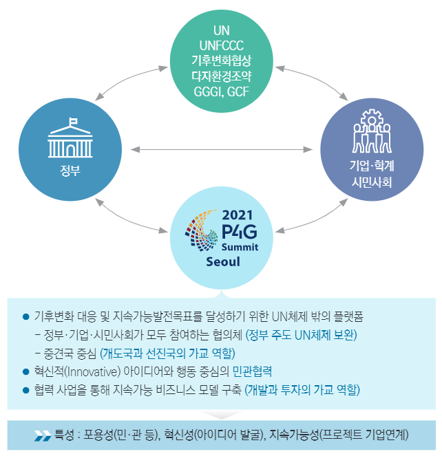 P4G는 정부기관과 더불어 민간부문인 기업 시민사회 등이 파트너로 참여하는 21세기 융합형 조직으로, 기후변화 대응과 지속가능한 발전목표를 달성하려는 글로벌 협의체이다. 국제적인 협의체는 일반적으로 국가는 국가 간, 기업은 기업 간, 시민사회는 시민사회간 회의체를 각각 형성해 운영된다.
