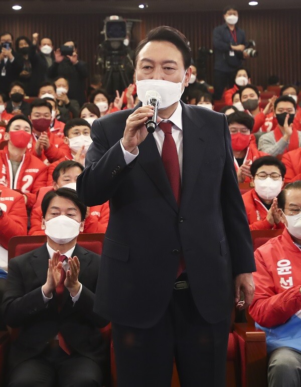 윤 당선인은 10일 대선 승리가 확정된 뒤 국회도서관에 마련된 당 개표상황실을 찾아 “이 결과는 저와 국민의힘, 안철수 대표와 함께한 국민의당의 승리라기보다는 위대한 국민의 승리가 아닌가 생각한다”며 이렇게 당선 소감을 말했다.