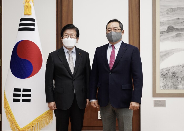 ▲사진 왼쪽부터 박병석 국회의장, 무역협회 구자열 회장 (사진 = 무역협회 제공) |