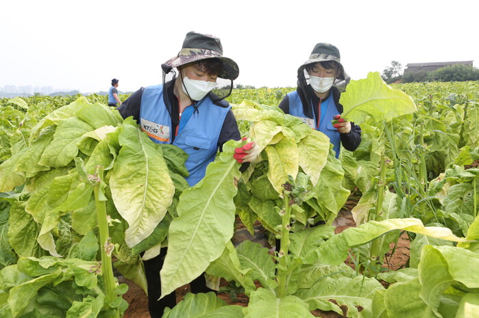 올해는 원료본부와 김천공장 임직원들이 아산시 둔포면 소재 농가를 방문해 1만6000㎡의 경작지서 약 5700kg의 잎담배 수확을 도왔다.