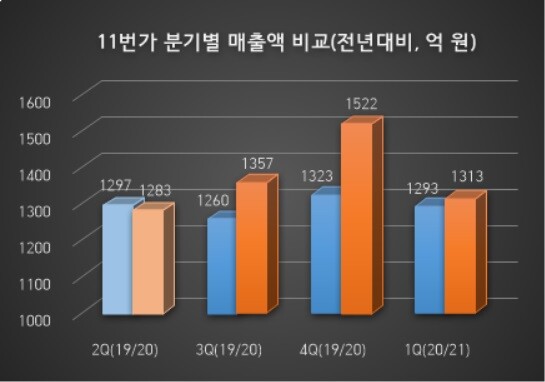 11일 SK텔레콤의 영업실적 공시를 통해 공개된 11번가 주식회사(사장 이상호)의 2021년 1분기 매출액은 전년동기대비 20억원 늘어 1313억원을 기록했다.