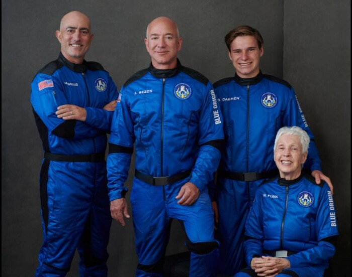 이번 비행엔 베이조스 의장과 동생 마크 베이조스, 80대 노인인 윌리 펑크, 18세 청년 올리버 데이먼이 함께 캡슐에 탑승했다.