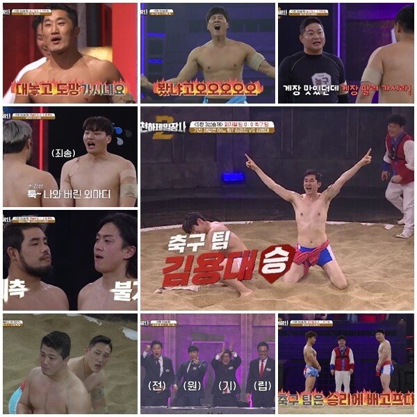 동계팀이 ‘우승 후보’ 레슬링팀을 상대로 ‘2:3’의 석패로 경기를 마무리한 가운데, 마지막으로 피지컬팀과 축구팀의 대격돌이 펼쳐졌다. 이경규는 “축구팀은 2강 1약이다. 약은 김용대”라고 분석했다. 축구팀에서 유일하게 1승도 거두지 못한 김용대는 이를 악물고 모래판에 섰다. 그는 김경진을 상대로 빠르게 돌다가 역공을 펼쳤고 마침내 김경진을 눕혔다. 이에 모두가 벌떡 일어나 “대한민국”을 연호했고 김용대는 “꿈은 이루어진다!”고 외쳤다.