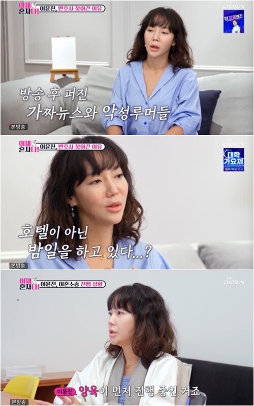 현재 발리에 거주 중인 이윤진은 서울에 오자마자 변호사 사무실을 찾았다. 이윤진은 "방송 후 많은 분들이 응원을 주셨지만, 가짜 뉴스나 악성 루머들이 온라인상에 많이 배포가 됐다. 혹시 아이들이나 부모님이 보시면 상처 받을 것 같다"며 변호사를 찾은 이유를 설명했다.