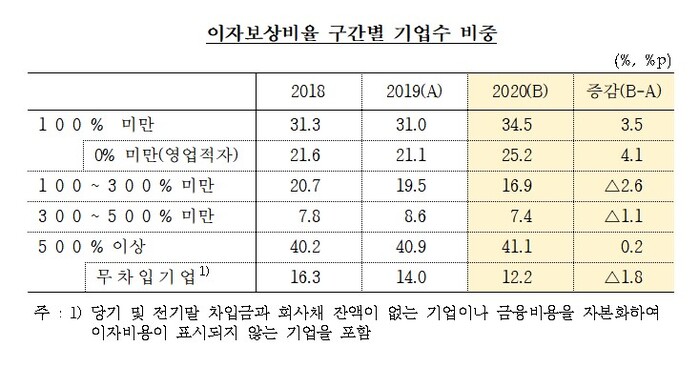 이자보상비율을 구간별로 나눠볼 때, 100% 미만 기업 수 비중은 2019년 31.0%에서 2020년 34.5%로 3.5%p 증가했다.