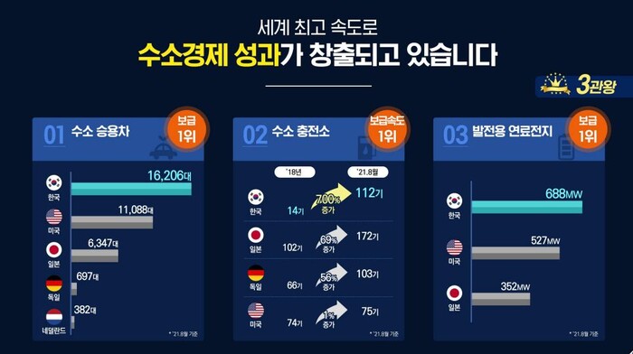 정부는 지난 2019년 1월 수소경제 활성화 로드맵 발표 이후, ▲세계 최초 수소법 제정 ▲R&D, 인프라, 수소차, 충전소, 안전, 표준 등 6대 분야별 정책 마련 ▲수소경제위원회 출범 등 제도적 기반을 구축했다.