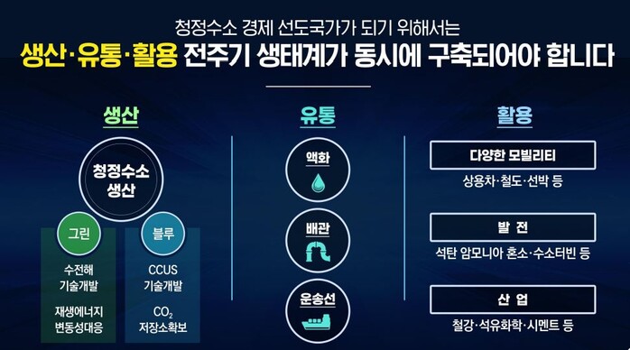다른 나라의 태양광, 풍력 등을 활용해 국내 재생에너지 기술로 에너지를 생산, 국내 수전해 기술로 수소로 전환 후, 국산 선박으로 운송해 국내 발전과 산업에 활용하는 계획이다.