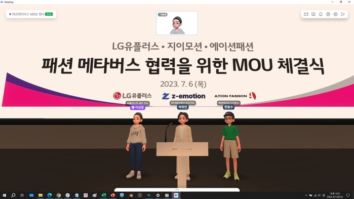 [메가경제=주영래 기자]LG유플러스(대표 황현식)는 패션 기업 ‘에이션패션(대표 박희찬)’, 패션테크 전문기업 ‘지이모션(대표 한동수)’과 패션 메타버스 사업 협력을 위한 양해각서를 체결하고 패션 메타버스 시장에 진출한다고 9일 밝혔다.