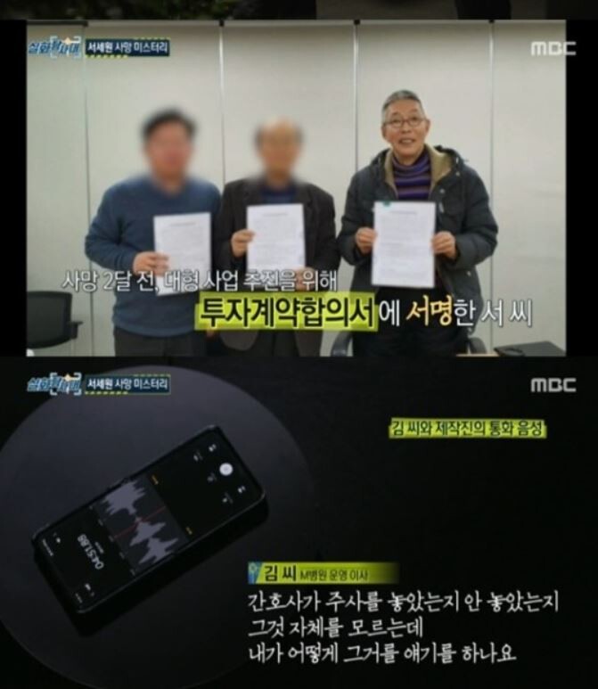 그런가 하면 서세원과 현지서 사업을 함께 하기로 한 동업자 김씨가 프로포폴 주사액을 짜서 버렸다는 목격자의 증언도 공개됐다. 하지만 사건의 열쇠를 쥐고 있는 김 씨는 "간호사가 주사를 놓은 것 자체를 모른다"라고 주장했다.