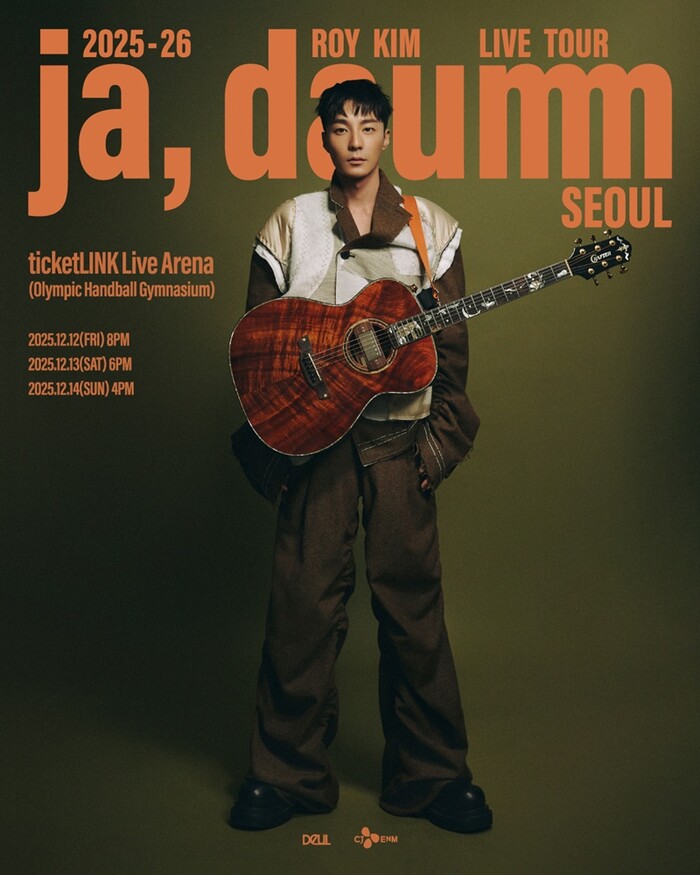 로이킴(본명 김상우)은 지난 13일 공식 SNS를 통해 단독 콘서트 ‘2025-26 로이킴 LIVE TOUR [ja, daumm]’의 포스터를 공개했다. 이번 콘서트는 12월 12일부터 14일까지 3일간, 서울 송파구 올림픽공원 티켓링크 라이브 아레나(올림픽 핸드볼경기장)에서 열린다.