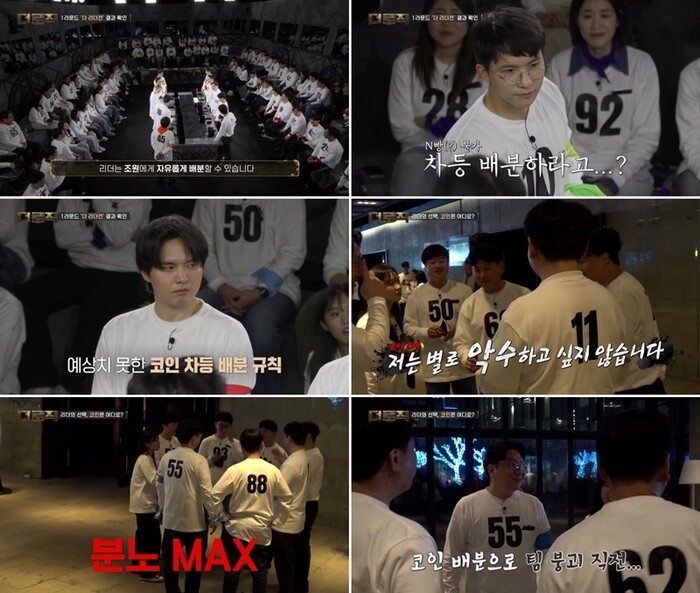 이후 리더들은 각자의 기준에 따라 팀원들에게 코인을 나눠주고, 결과를 받아든 팀원들의 반응은 극명하게 엇갈린다. “대를 이어서 충성해야겠다”라며 만족감을 드러내는 이들이 있는가 하면, “왜 나는 0개냐?”면서 서운함을 표하는 이도 나오는 것. 특히 “(리더와) 악수도 별로 하고 싶지 않다”, “같이 식사하기도 싫다”, “정적을 제거한 느낌이라 기분이 나쁘다” 등 분노가 쏟아져 나오면서, 팀워크가 순식간에 흔들리는 초유의 상황이 벌어진다. 과연 코인 분배를 둘러싼 갈등의 여파가 10개 팀에 어떤 변화를 가져올지, 냉랭해진 분위기 속 플레이어들이 다음 미션을 어떻게 헤쳐 나갈지 관심이 집중된다.