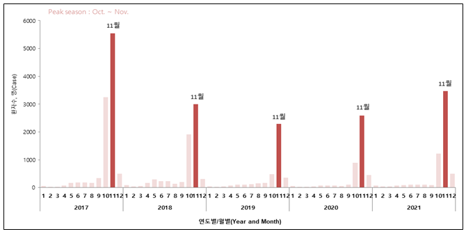 ▲ 2017년부터 2021년까지 연도별, 월별 쯔쯔가무시증 환자 발생 현황. [질병관리청 제공] |