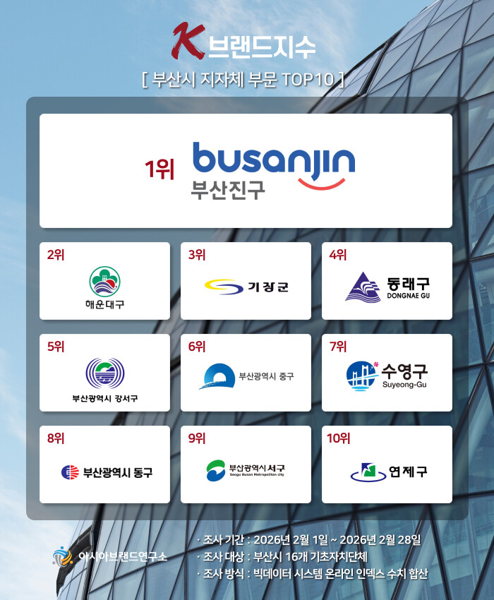 한정근 아시아브랜드연구소 대표는 “이번 K-브랜드지수 부산시 지자체 부문은 과거 부산을 상징하는 특정 관광 특구에 편중됐던 것과 달리 실질적 생활 인프라와 도심 상권의 활력으로 옮겨가고 있음을 보여주고 있다. 1위에 등극한 부산진구는 서면이라는 거대 상권과 촘촘한 교통망을 바탕으로 시민들의 일상과 가장 밀접하게 교감하며, 기존의 압도적 1강 체제를 무너뜨리는 저력을 과시한 상황"이라고 설명했다.