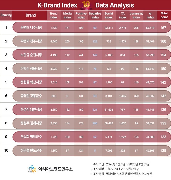 이번 K-브랜드지수 전라도 지자체장 부문은 전라도 20개 기초자치단체장을 대상으로, 2026년 1월 1일부터 1월 31일까지의 온라인 빅데이터 102만 2186건을 분석했다.