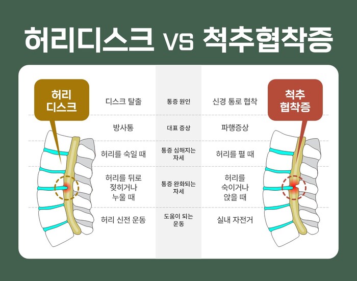 통증 변화 양상도 구분 기준으로 거론된다. 허리디스크 환자는 허리를 숙일 때 통증이 악화되지만, 척추협착증은 허리를 숙이면 척추관 공간이 넓어져 통증이 완화되는 경향이 있다.
